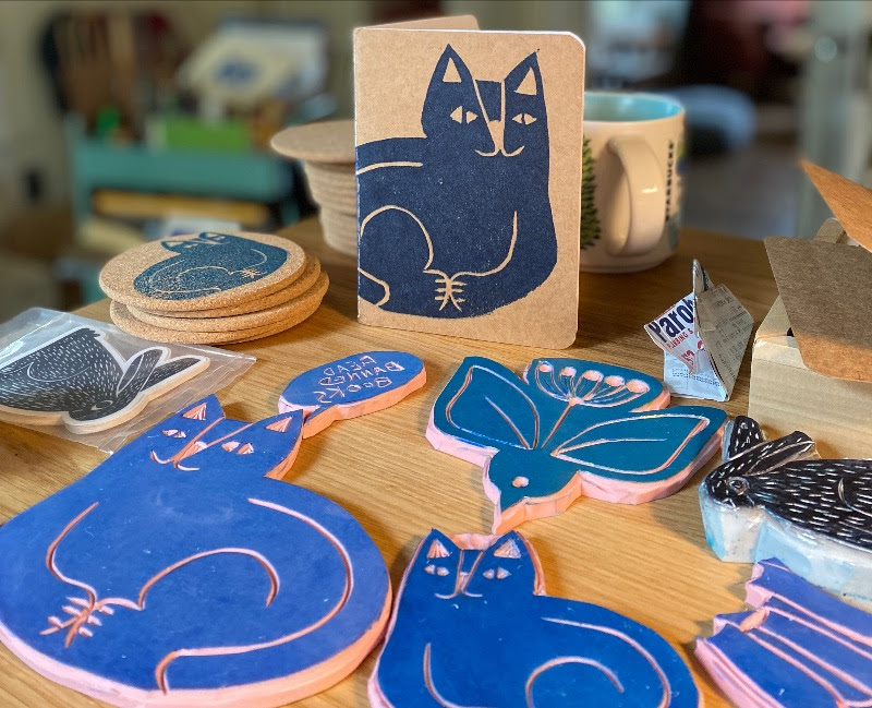 I’ve been busy carving and printing all kinds of cats on paper and textiles. Also, I’m having a moment with blue ink. I waited months for this tube of Prussian Blue and I intend to use it!